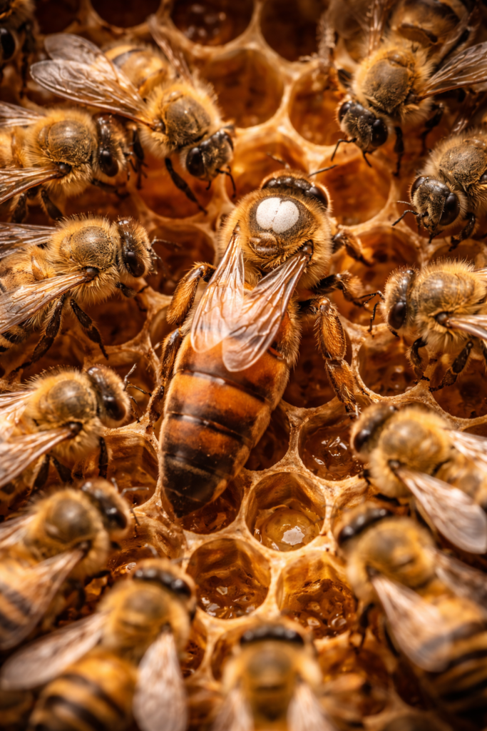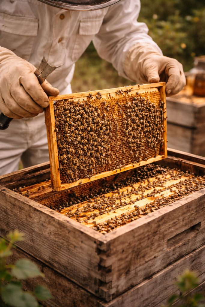 Chaque ruche est visitée avec attention : état des cadres, vitalité de la colonie, présence de la reine, réserves disponibles.