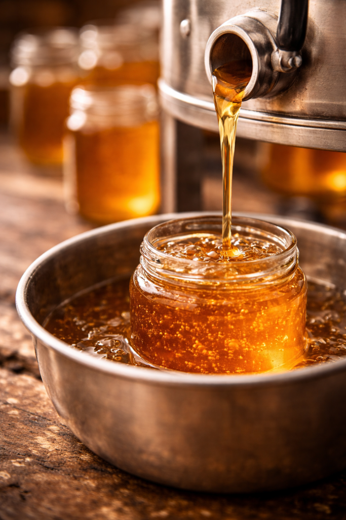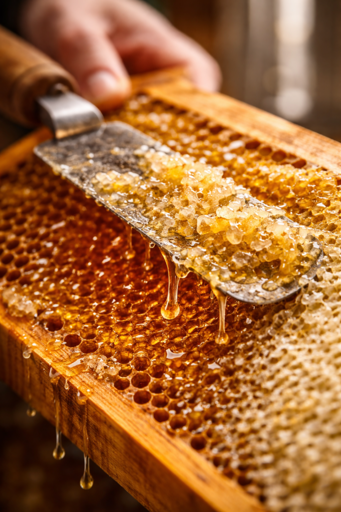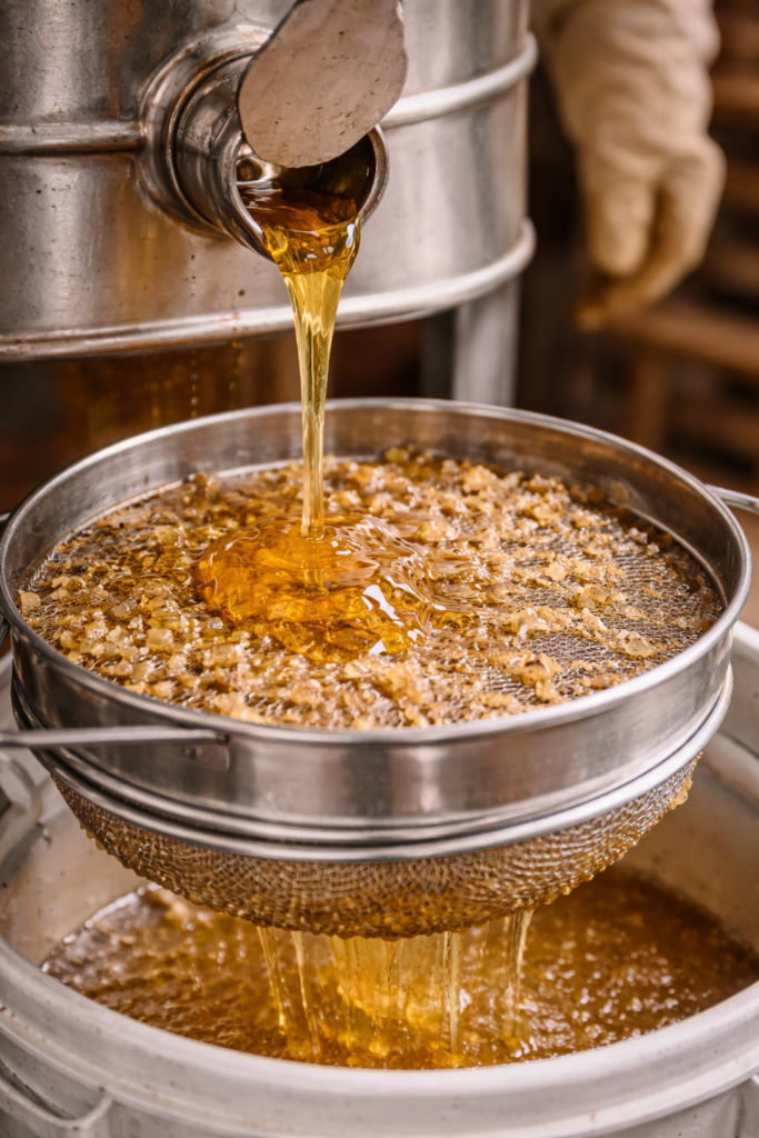 Le miel est ensuite filtré grossièrement, uniquement pour retirer les impuretés naturelles (morceaux de cire, bulles d’air).