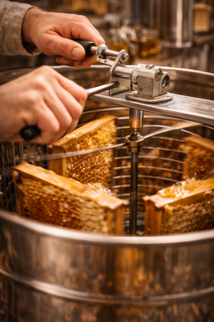 Par rotation douce, le miel est libéré des alvéoles et s’écoule naturellement.