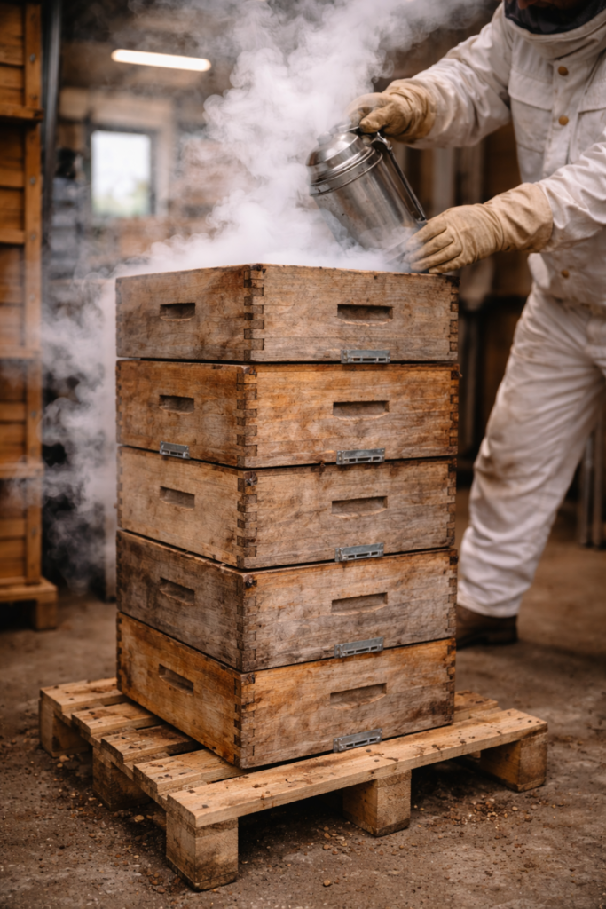 Les cadres sont nettoyés et protégés contre la teigne, notamment par des méthodes physiques comme la fumigation ou le froid, afin d’éviter tout développement parasite.